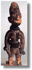 Significance researched to date: The twin birth rate among the Yoruba is proportionately high compared to other geographic regions. Because twins double the financial burden, twins born in poor families were formerly put to death. The ruling families, however, instituted a twin cult under instructions from an oracle, which said that the killing of twins was offending Shango, the god of thunder. Mothers of twins had to dance to Ibeji, the spirit of twins, every five days. Offerings of food are thought to placate the spiritÕs temperament. Upon the death of a twin, the mother commissions an ere figure. If both twins die, two ere figures are carved. If the ere figure is not provided, the Yoruba believe that the soul of the deceased will seek vengeance by bringing terrible misfortune to the other twin or to the entire family. Ere figures are carved as the same sex as the deceased twin, but as an adult, with breasts and genitals indicating strength. Often the family Ila scarification marks are included. Indigo dye and ground camwood are rubbed on to beautify and protect the figures from harm. Beads associated with the orisa worshipped are selected. Cowrie shells or brass rings, cloths, finely detailed coiffures or hats are also carefully chosen. The ere ibeji are placed on the household altar. There they are fed and clothed just as the surviving twin is fed and clothed to placate Shango. Ere ibeji figures are dedicated to Shango, by the application of campowder. Shango is also known as Oko Ibeji, Òthe husband of twins.Ó The twinsÕ connection to Shango can also be seen in the clothing provided for the figures. Often tiny capes of cowrie shells are made for the figures. These capes, called Ewu Shango, are miniatures of the ones worn by priests during the Shango ritual. The cowrie shell symbolizes Shango in that he is the god of material wealth and the cowrie shell is an ancient form of money. With the death of the mother, Ifa is consulted. Ifa summons the spirit of Ibeji, who determines what should happen to the ere ibeji. Sometimes the figure is buried with the mother. Other times, the figure is passed to another family member to be cared for. (Drewal, 170-5; Perani, 147-8; Ulrich, 2; Gillon, 244)
