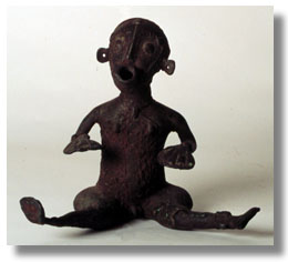 | This is one of a pair of seated figures of cast bronze from the Cameroonian Grasslands, both excellent examples with feet turned outward. Relief forms on the bodies are similar to those on objects from Igbo Ukwu. [1144. Female has projections representing coiffure. - see W0181] 1145. Male has protruding open mouth. |