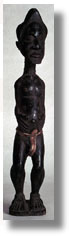 | This pair of Baule figures both have oversized heads, necks angled slightly forward, arms and hands carved to body, attenuated legs, large feet resting on socle bases, multiple facial scarifications, linear coiffures, and coiffure ornamentation. Both figures are by same carver and are portrait figures of a chief and his wife, with scarification marks as identification on the breast, loincloths attached, and necklaces. They are finely carved, with an exellent use patina. A. Male; [B. Female, with beads at neck - see W0127] |