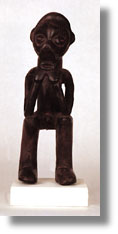 | This wood standing male figure with hands to the chin has a darkened surface. |