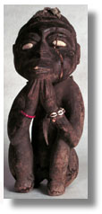 | This pair of squatting figures, Bagga/Koronko, is well carved, with a good use patina and kaolin on eyes. A. Male has hands pointed under chin, resting elbows on knees, a patch of cloth on head and back, cowrie shells on left wrist, red beads on right wrist. [B. Female has hands to ears, incised breasts. - See W0159] |