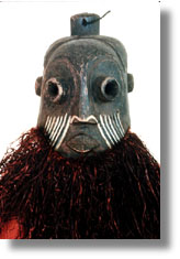 Click on the image to view a high resolution image. To return to thumbnails, use your computer's "back" button. Type: mask Ethnic Group: Kuba (Bakuba) Country: Democratic Republic of Congo (Zaire) ECU Number: L0013 Description: This wood helmet mask has projecting eyes and a crown projection, painted areas, and fiber suspensions.Provenance: Kuba royal family Significance researched to date: